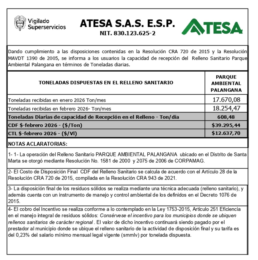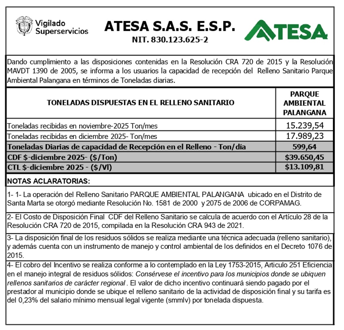 Dando cumplimiento a las disposiciones contenidas en la Resolución CRA 720 de 2015 y la Resolución MAVDT 1390 de 2005, se informa a los usuarios la capacidad de recepción del Relleno Sanitario Parque Ambiental Palangana.